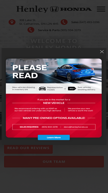 100%Henley Honda in St.Catharines has New and Used Honda Cars and SUVs for sale. Call (905) 934-3379 for St.Catharines Honda Specials and Promotions.