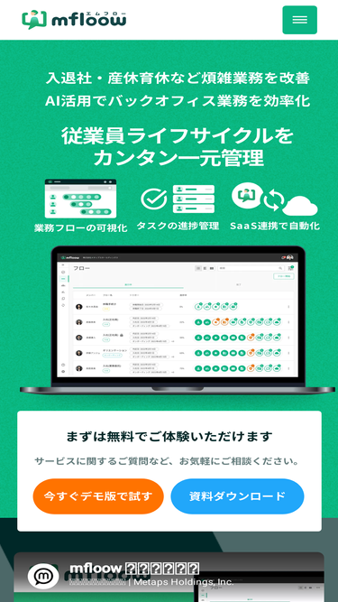 83%mfloow(エムフロー)は入社や退職、休職など人事・総務・情シス部門が行う「従業員ライフサイクル」の手続きに特化したタスク管理サービスです。