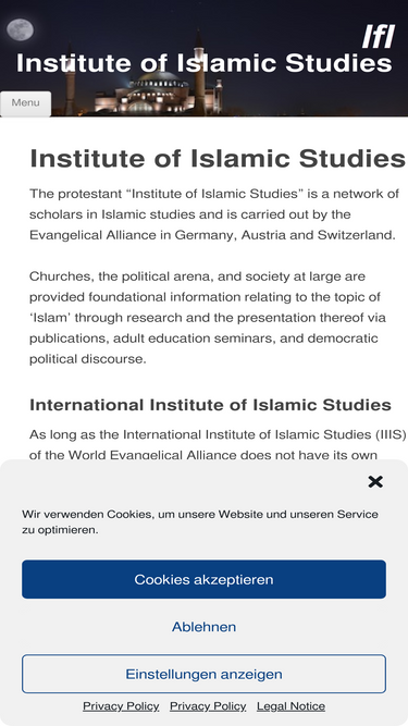 99%Das Institut für Islamfragen Das evangelische Institut für Islamfragen ist ein Netzwerk von Islamwissenschaftlern und wird von den Evangelischen Allianzen in Deutschland, in Österreich und in der Schweiz getragen. Durch Forschung und deren Präsentation in Veröffentlichung, Seminaren der Erwachsenenbildung und im politischen demokratischen Diskurs sollen Gesellschaft, Kirchen und Politik mit grundlegenden Informationen rund um das