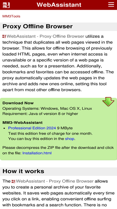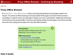 67%the proxy offline browser archives visited web pages with your browser to be used on- and offline. offline each page is available with its original url. there is no difference between surfing in the internet or archive. you can even use your bookmarks offline. this proxy offline browser is an ideal addition to every browser! mm3-webassistant - proxy offline browser - archiving by browsing
