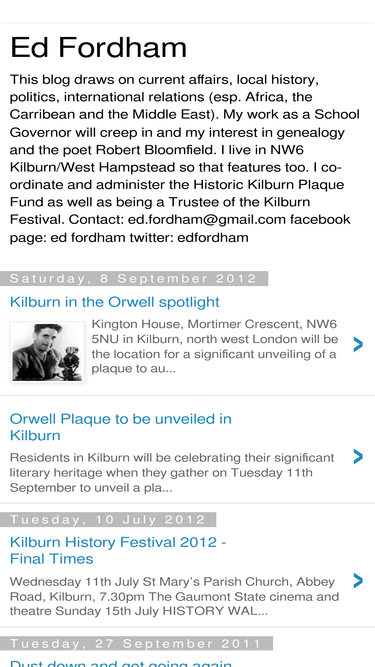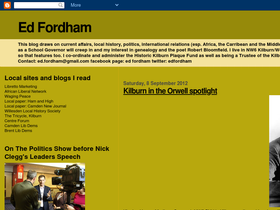 89%This blog draws on current affairs, local history, politics, international relations (esp. Africa, the Carribean and the Middle East). My work as a School Governor will creep in and my interest in genealogy and the poet Robert Bloomfield. I live in NW6 Kilburn/West Hampstead so that features too. I co-ordinate and administer the Historic Kilburn Plaque Fund as well as being a Trustee of the Kilburn Festival. Contact: ed.fordham@gmail.com facebook page: ed fordham twitter: edfordham