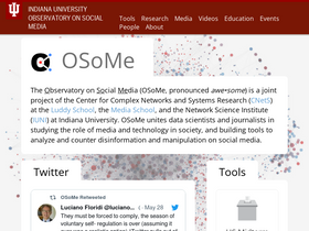 71%Follow us on Bluesky (@osome.iu.edu), X (@OSoMe_IU), Facebook (@OSoMeIU), or Google Groups (OSoMe Forum) for updates and announcements about the Observatory...