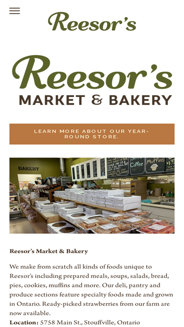 We make good food easy and accessible at our year-round store Reesor's Market & Bakery; order 24 hours a day at Reesor's Online Market; or visit our seasonal Reesor's Farm Market. We make our own baked goods and entrees for you to enjoy at home. During growing season, we offer produce from our o
