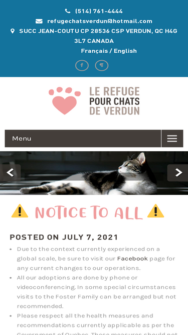 99%ADOPTER UN CHAT ! Le Refuge pour chats de Verdun a pour mission de trouver le meilleur foyer permanent pour ses chats et recherche des adoptants sérieux qui comprennent que l’adoption d’un animal de compagnie est un engagement pour la durée complète de la vie de l’animal, pouvant s’étendre sur plus de 15 ans. Dans le but d’assurer le bien-être de l’animal, cet engagement occasionne des dépenses financières régulières, non négligeables, comme une alimentation de qualité, litière, et suivis vétérinaires annuels. De plus, le maintien en bonne santé du chat peut aussi engendrer des déboursés élevés et imprévisibles, nécessaires pour...