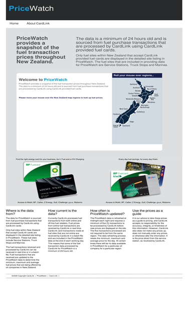 82%cardlink pricewatch provides a snapshot of the fuel transaction prices throughout new zealand. the data is a minimum of 24 hours old and is sourced from fuel purchase transactions that are processed by cardlink using cardlink provided fuel cards.
