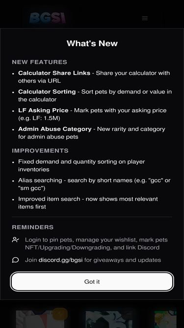 100%BGSI.GG - The ultimate resource for Bubble Gum Simulator Infinity with real-time pet values, live hatches, value calculator, and comprehensive egg information.