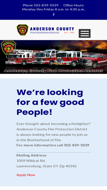 98%Anderson County Fire Protection District, is located at 1009 Wildcat Rd. Lawrenceburg, KY 40342 . For emergencies dial 911, non emergencies dial 502-839-5039. Donate to our fund drive or volunteer! Become a firefighter, members needed join today! Hall rentals available. Anderson County Fire Protection District is part of the FireCompanies.com network of fire departments.