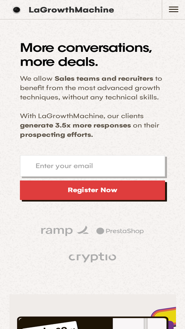 98%La Growth Machine is the all-in-one platform for effortless multichannel prospecting. It helps you automate time-consuming tasks such as: - Building prospect lists - Finding decision-makers - Enriching contacts with verified data - Running multichannel outreach campaigns - Managing and replying to conversations Designed for both beginners and outbound experts, La Growth Machine adapts to all skill levels — making outreach more efficient, scalable, and effective.