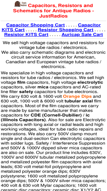 85%specializes in high voltage capacitors and resistors for vintage tube radios / electronics. also carries schematic diagrams and electronic circuit service information for american, canadian and european antique radios / electronics.