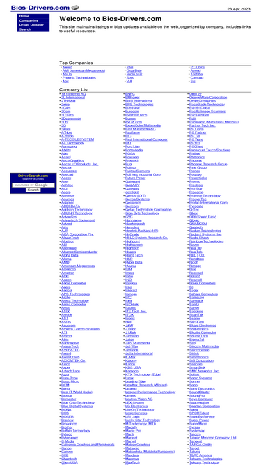 100%this site maintains listings of bios updates available on the web, organized by company. includes links to useful resources. includes award bios, ami bios, asus bios, phoenix bios, abit bios, intel bios, giga-byte bios, microstar bios, soyo bios, via bios, pc chips bios, atrend bios, toshiba bios, compaq bios, sis bios, etc.