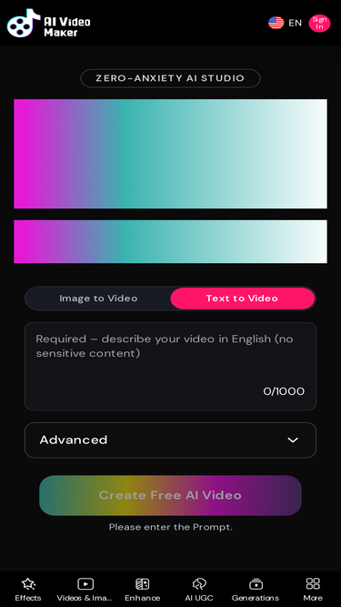 90%Create free AI videos online with the best AI video maker. Generate unlimited 5-second 480p AI videos from text or images. No sign up. Upgrade for 8-second videos, 1080p HD, and commercial rights. Generate text-to-video, image-to-video, talking photos, and ads fast.