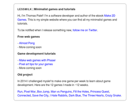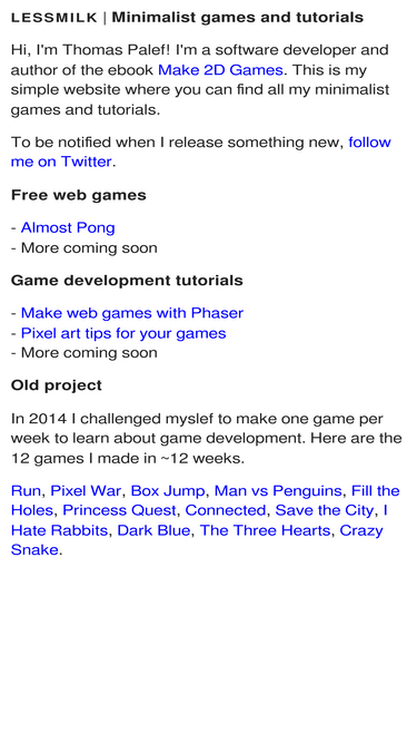 73%hi, i'm thomas palef! i'm a software developer and author. this is my minimalist website where you can find all my games.