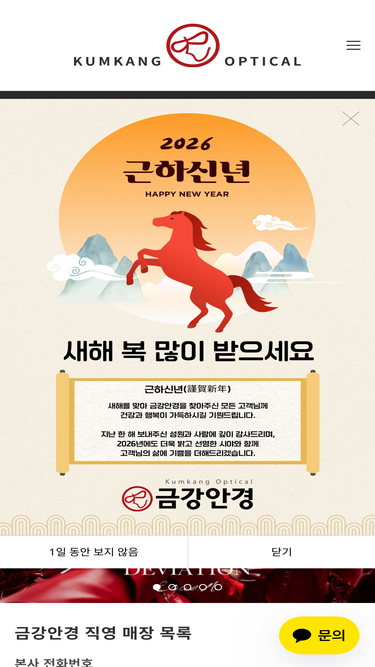 85%성실과 신의를 바탕으로 항상 손님의 눈 보호를 위해 한 길을 걸어온 금강안경은 1942년 故 김수영 초대회장에 의해 창립되었으며, 2대 김경화 회장을 이어, 2001년 3대 김진호 대표가 가업을 승계, 오늘에 이르고 있습니다.