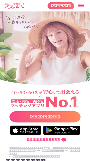40代・50代・60代が安心して使える恋活・婚活・再婚活マッチングアプリ。同世代だからこそ、趣味や価値観の合う素敵なお相手と気兼ねなく出会うことができます。40歳未満の方・独身でない方はご利用いただけません。