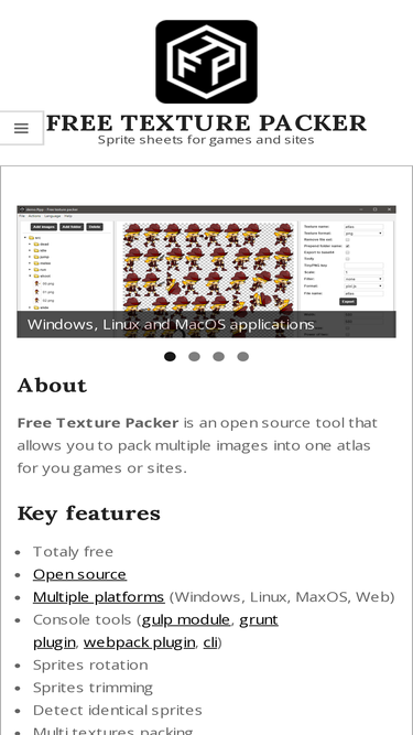 85%About Free Texture Packer is an open source tool that allows you to pack multiple images into one atlas for you games or sites. Key features Totaly free Open source Multiple platforms (Windows, Linux, MaxOS, Web) Console tools (gulp module, grunt plugin, webpack plugin, cli) Sprites rotation Sprites trimming Detect identicalContinue Reading