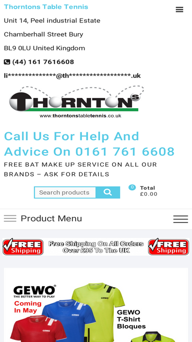 92%Our contact details: Thorntons Table Tennis Unit 14, Peel industrial Estate, Chamberhall Street, Bury BL9 0LU. United Kingdom Phone: 0161 761 6608 Fax: 0161 762 9402 Email: william.thornton2@btopenworld.com VAT registration number: 741-4923-36 Making a purchase Making a purchase could not be easier. Just browse our store, and add any items…