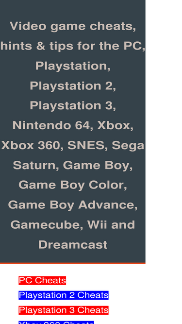 87%video game cheats, hints, tips for the pc, playstation, playstation 2, nintendo 64, xbox, snes, sega saturn, game boy, gamecube and dreamcast