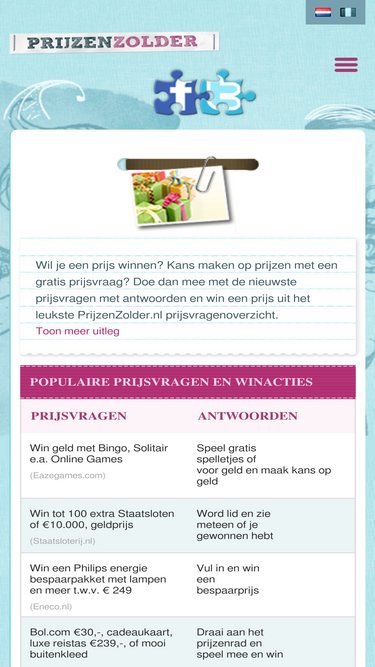 92%prijsvragen winnen op prijzenzolder.nl. dat kan. elke dag staan hier de nieuwste prijsvragen met antwoorden. win een prijs met gratis prijsvraag, prijzen winnen met kinderprijsvragen of speel mee en win geld prijs.