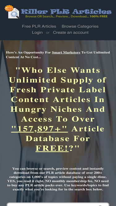 84%free killer plr articles - get access to over 157,897+ fully browsable & searchable private label content database... who else wants unlimited supply of fresh private label content articles in hungry niches and access to over 157,897+ fully browsable and searchable database for a ridiculous price every month...