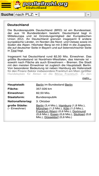 82%Finden Sie Postleitzahlen für alle Orte in Deutschland. PLZ-Suche mit interaktiver Karte, Bundesländern, Stadt- und Gemeindeverzeichnis sowie zusätzlichen Ortsinformationen.