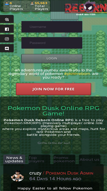 90%Do you like Pokemon? Dusk Reborn is a free to play Pokemon MMORPG (massively multiplayer online role playing game) where you explore mysterious areas, hunt for rare Pokémon and level up alongside your friends. Pokemon Online Game, Pokemon Reborn.