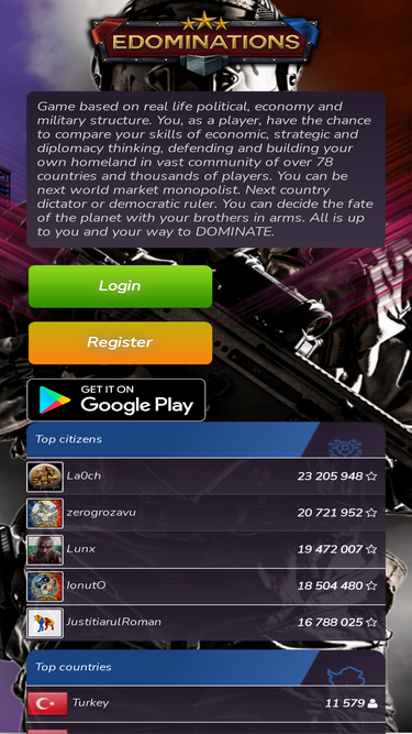 86%Multiplayer strategy game that allows users to run the economy, conquer other nations, become a politician and rule a country,or liberate your country and start a resistance war.