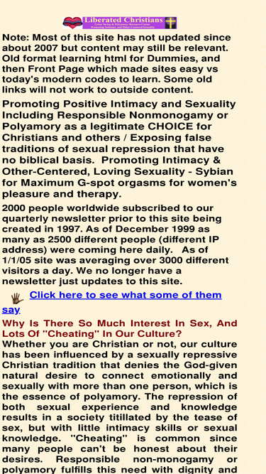 78%liberated christians, promoting positive intimacy and sexuality, responsible nonmonogamy, polyamory or 'swinging' as a legitimate choice for christians and others. exposing false traditions of sexual repression that have no biblical basis. promoting intimacy & other-centered loving sexuality. sybian for maximum g-spot orgasms for women's pleasure and therapy