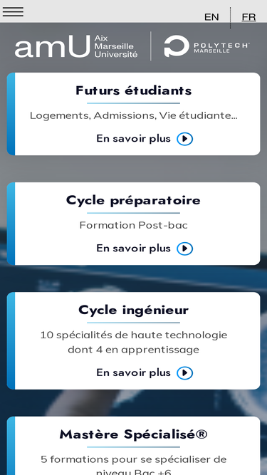 87%polytech marseille, ecole d'ingénieurs d'aix-marseille université, propose des formations d'ingénieur habilitées cti dans 8 spécialités. recrutement par concours post-bac - cycle préparatoire / prépa intégré(e)- ou à bac +2/3/4 -cycle ingénieur.