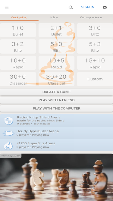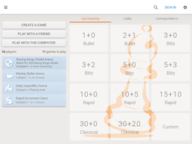 85%Play fast-paced chess tournaments! Join an official scheduled tournament, or create your own. Bullet, Blitz, Classical, Chess960, King of the Hill, Threecheck, and more options available for endless chess fun.