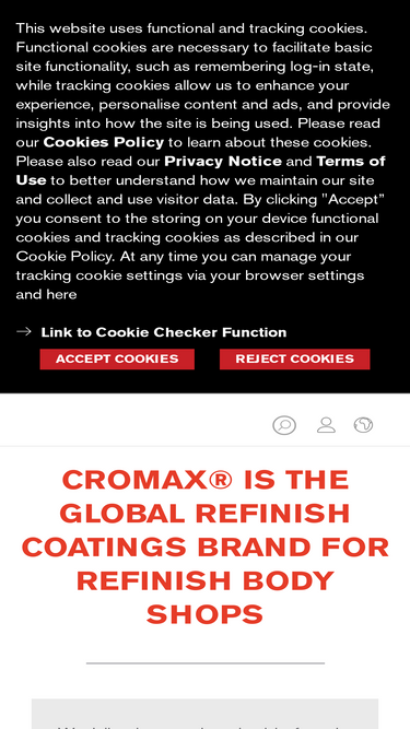 92%Cromax ist eine globale Lackmarke für Autoreparaturbetriebe. Wir bringen erhöhte Produktivität in jeden Winkel der Lackierwerkstatt - mit Lacksystemen, die für einfache, schnelle und genaue Applikation entwickelt wurden, mit Vor-Ort-Support in puncto Betriebsführung und Vermarktung sowie mit pragmatischen Innovationen zur Vereinfachung und Beschleunigung des Lackierprozesses.