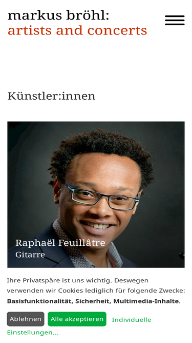 100%markus bröehl : artists and concerts betreut herausragende Künstler wie Albrecht Mayer, Sophie Dervaux, Diana Tishchenko, Victor Julien-Laferrière, Gabriel Schwabe, Boris Giltburg und Fabian Müller
