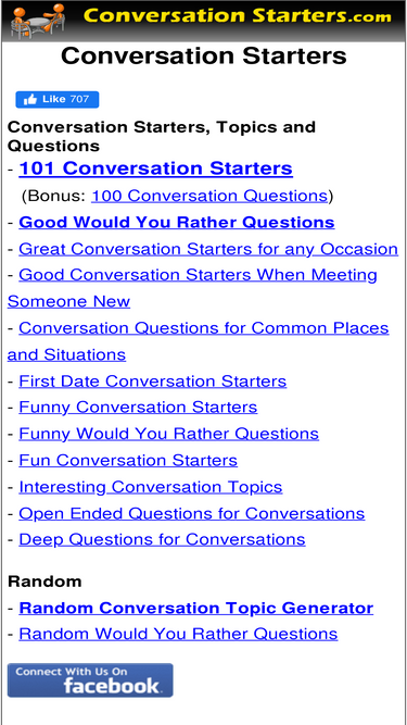 76%want great conversation starters? we have tons of conversation starters, questions and topics for all kinds of situations.