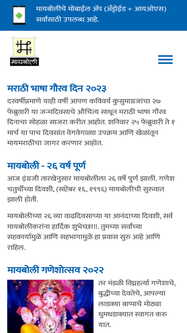 100%maayboli: a great resource for marathi language, marathi people and maharashtrian culture. visit marathi sites, send marathi postcards, listen to marathi music and chat with people from maharashtra. marathi is the language spoken by 70 million people and is official language of maharashtra state in india.