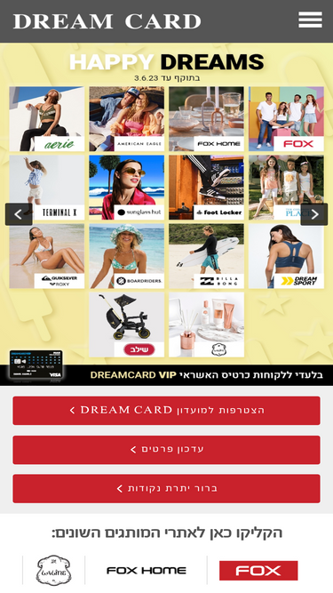 73%מועדון DREAM CARD כל המותגים האהובים במקום אחד. DREAM CARD הוא מועדון הלקוחות של קבוצת פוקס המציע הטבות שוות במותגים שאתם אוהבים: