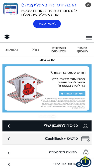 82%באתר ישראכרט ניתן לבצע פעולות בחשבונכם הפרטי או העסקי, לקחת הלוואה, להזמין כרטיסי אשראי, פתרונות תשלום ואשראי לעסק וליהנות מהטבות ייחודיות