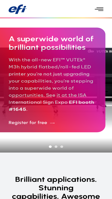 85%Electronics for Imaging (EFI) is a global technology company, leading the worldwide transformation from analog to digital imaging. EFI develops breakthrough technologies for manufacturing signage, packaging, and textiles with a wide range of printers, inks, and software working together to increase profits, lower costs, improve productivity, and optimize efficiency.