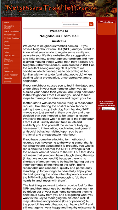 56%Dealing with a neighbour from hell in Australia? You are not alone. Practical guidance, emotional support, and pointers to legal and procedural information for Australians in difficult neighbour situations.
