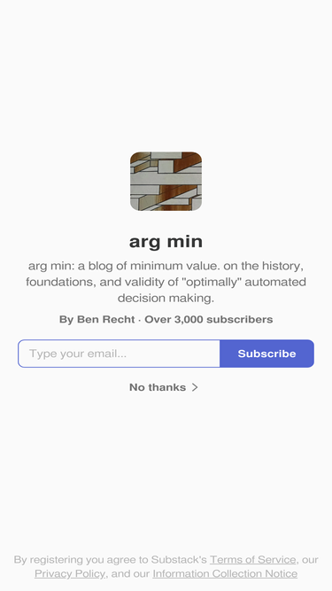 arg min: a blog of minimum value. on the history, foundations, and validity of "optimally" automated decision making. Click to read arg min, by Ben Recht, a Substack publication with thousands of subscribers.