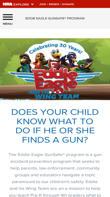 93%The Eddie Eagle GunSafe® Program is a gun accident prevention program that seeks to help parents, law enforcement, community groups and educators navigate a topic paramount to our children’s safety. Eddie and his Wing Team are on a mission to help you teach Pre-K through 4th graders what to do if they ever come across a gun… STOP! Don’t Touch! Run Away! Tell a Grown-up!