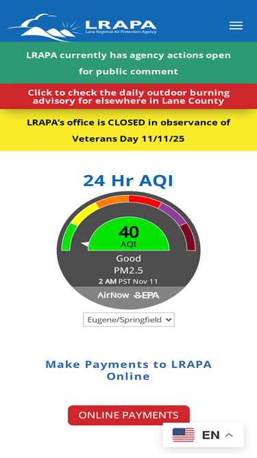 74%LRAPA is the air quality authority for Lane County. Since our inception, the air quality for the county’s metro area has improved.