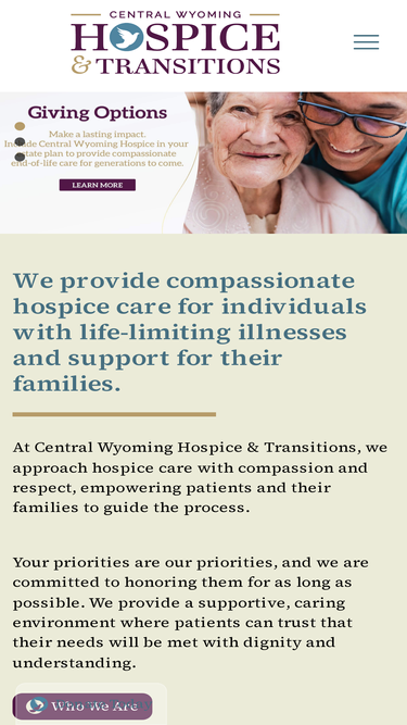 96%At Central Wyoming Hospice, we provide quality, compassionate hospice care for individuals facing a life-limiting illness, as well as their families.