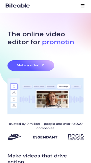 79%Make on-brand videos with the leading online AI video maker. Biteable is the leading solution for creating concise, engaging, on-brand video content.