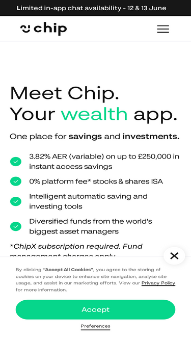 92%Chip is an investing and savings app. Download Chip to begin investing in funds, our general investment account and open a savings account.