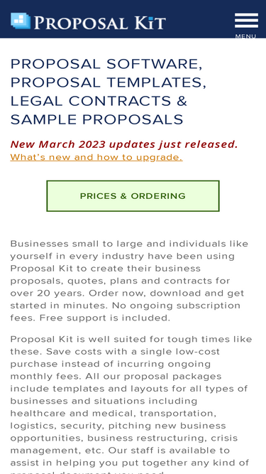 96%Proposal Kit Professional is the most extensive and detailed proposal and contract document and software package available anywhere at any price. It was first started in 1997 and has been expanded and updated every year. It is now in its 23nd edition and includes over 15,000 pages of content.