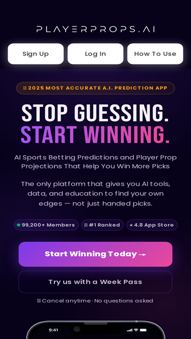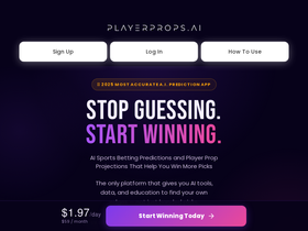 90%AI-powered player prop predictions and sports betting tools for smarter wagering across NFL, NBA, MLB, and more. Unlock smarter picks with data, AI-powered projections, comprehensive research tools, and expert insights across all major leagues. Access our AI Player Prop Predictor, PrizePicks Optimizer, AI Moneyline, Spread, and Total Predictors, Historical Player & Team Data, Betting Education Tools, and Full Community Discord Chat Access.