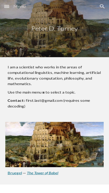 100%I am a scientist who works in the areas of computational linguistics, machine learning, artificial life, evolutionary computation, philosophy, and mathematics. Use the main menu ≡ to select a topic. Contact: first.last@gmail.com (requires some decoding)