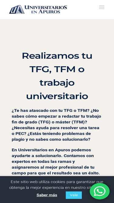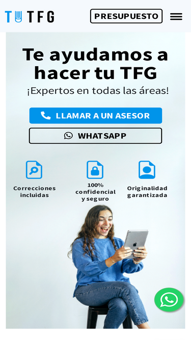 100%¿Necesitas corregir tu TFG?En Universitarios en Apuros somos expertos en la elaboración de Trabajos Fin de Grado y podemos ayudarte a corregir los errores de tu TFG. Llama al 621 212 688 Solicita tu presupuesto Servicio de revisión y corrección de tu TFGSomos conscientes de que en ocasiones los tutores del TFG marcan un nivel de exigencia muy elevado y no aceptan tu TFG si no está impecable a todos los niveles. Por ello, te ofrecemos el servicio que necesitas para pulir tu TFG. Solicita presupuesto Cómo te ayudamos a revisar y corregir tu TFGRevisaremos en profundidad el estado de tu proyecto y realizaremos todos los cambios necesarios para que cumpla con los requisitos y normativa. Reformulación de los objetivosRevisión y reelaboración del marco teóricoRevisión y corrección de resultadosRevisión de cohesión y estiloMejora y ampliación de bibliografíaReducción del plagio académico ¿Qué opinan nuestros clientes? Estaba totalmente bloqueado con mi TFG, no sabía por dónde empezar. Gracias a vuestra ayuda, conseguí terminarlo a tiempo. ¡Muy agradecido de verdad! Usuario Verificado Me faltaban ideas y organización para mi TFG. Me echasteis un cable y al final todo salió mucho mejor de lo que esperaba. Gracias por vuestro trabajo Usuario Verificado Al principio dudaba, pero vuestra ayuda fue increíble. Me guiasteis paso a paso con mi TFG, y gracias a eso logré presentarlo sin problemas. No lo habría conseguido sin vosotros Usuario Verificado Al principio pensaba que no lo iba a conseguir, pero con vuestra ayuda conseguí encaminar mi TFG. El resultado fue excelente. Usuario Verificado Estaba muy perdido con el enfoque de mi TFG y no sabía cómo