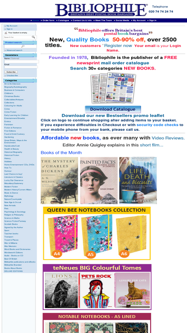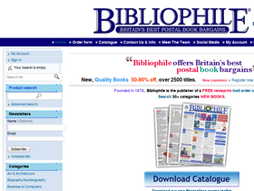 free monthly catalogue of 2000 new books at half cover price or less. britain's best postal book bargains is the strap line of the ever-popular newsprint catalogue published up to ten times a year since 1978, each containing 1000 mint condition books individually reviewed by the expert team with elegant and entertaining writing; in-house, honest reviews of the finest selections of reprints, classics and quality remainders (never to be printed again). the editor also regularly creates and films videos of illustrated art books, pop-ups and high-end illustrated books on youtube channel bibliophilebooks. established in 1978, a royal warrant by royal appointment was awarded in 2011 for bookselling to his royal highness the duke of edinburgh.