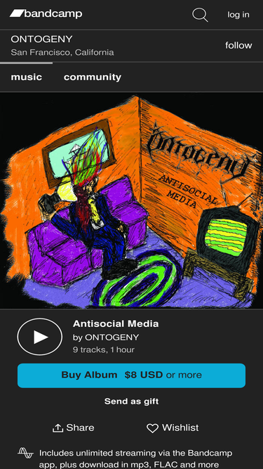 97%ontogeny ontogeny is a progressive death metal band from san francisco started in 2002. after many demos ontogeny released the first full length album in 2005 "pillars of perversion". with the additions of keith grimshaw, sam zuerner and chazz mcconnell discord and disillusion was recorded and released. ontogeny is currently seeking label representation for the 3rd full length hymns of ahriman in 2014. antisocial media, released 24 december 2018 1. living witness 2. long story short 3. reveling in cosmic bliss 4. martyr 5. research with a glance 6. tupperware prison palace 7. transcontinental webcam jam 8. what can i say? 9. antisocial media