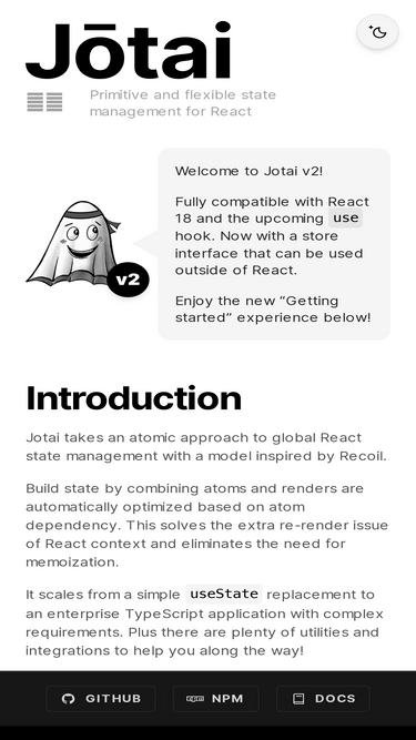73%Jotai takes a bottom-up approach to global React state management with an atomic model inspired by Recoil. One can build state by combining atoms and renders are optimized based on atom dependency. This solves the extra re-render issue of React context and eliminates the need for memoization.